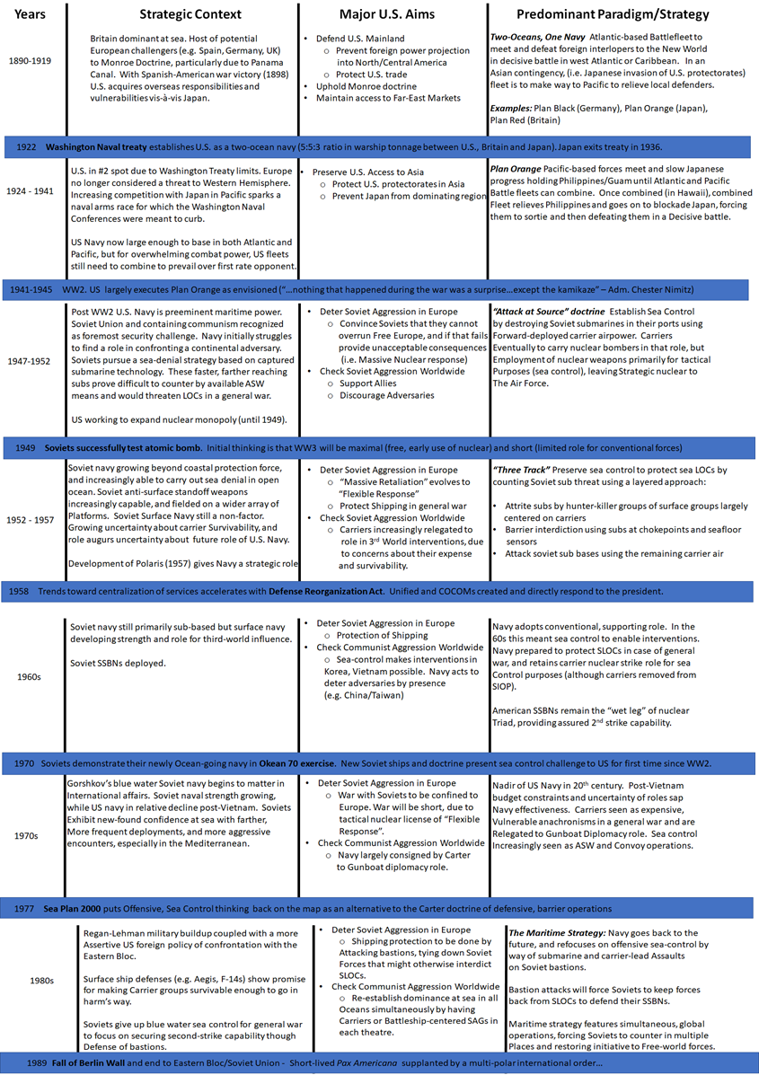 While the study of Strategies is an ongoing theme for this blog, the U.S. naval strategies of 1890-2000s are particularly interesting as they touch on so many of the geopolitical issues of their respective times, reflecting our national aspirations, fears, capabilities and values and expressing them in a form that presidents could advocate, legislatures could fund and servicemembers could fight.