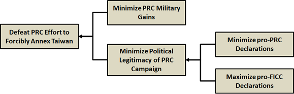 The Effect Desired is realized by the objective Defeat PRC Effort to Forcibly Annex Taiwan.  That objective is further decomposed into a primarily military (Minimize PRC Military Gains) and political (Minimize Political Legitimacy of PRC Campaign) components.
