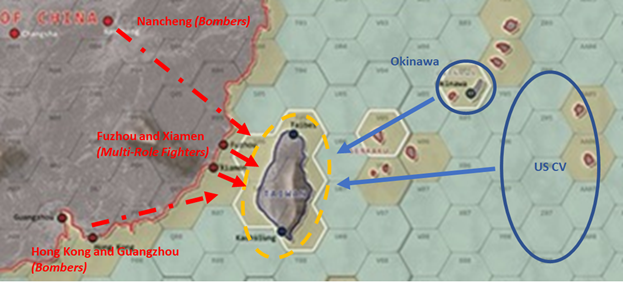 Unfortunately, the PLA(N) was able to dislodge the US CVBG from its safe area.  The PLA(N) had detailed two of its three CVBGs to force the Luzon strait in order to bring the Chinese carriers within reconnaissance range of the US carrier.  Unfortunately for the FICC, the PLA(N) superiority in surface forces (Sovremenny DDGs outnumbering and outranging the US Burke DDGs) won the battle for the Luzon strait for the PLA(N).  As a result, the US CVBG had to retreat to the east, leaving the PRC in complete control of Taiwan airspace.