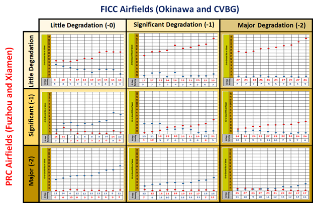 The US operational plan required a substantial degradation in PRC ability to put sorties over Taiwan.  If the PRC gained air superiority, they would be able to clear the Taiwan strait of the ROC navy, finish the ROC air force grounded by SRBM strikes and to drive the ROC Army away from the planned beachheads.  Even with the US and ROC regional land-based air grounded, degraded PRC airfields would have slowed these processes and possibly bought enough time for US reinforcements to stabilize the situation.  Since FICC air was unable to do this for the reasons already given, US LACMs launched from DDGs and SSNs in the area had to take up the slack.  Unfortunately, there were not enough of these to have much effect.  An encouraging development is the refitting of 4 Ohio-Class SSBNs to Tomahawk LACMs.  Each of these would be able to launch salvoes of up to 144 cruise missiles from their vertical launch tubes.  With these on station, the US could have trickled out enough cruise missiles to hit the most important PRC airfields and relieve pressure on the Taiwanese defenders until more substantial aid could arrive.