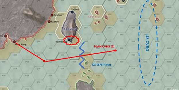 The US CVBG was to patrol to the eastt of Taiwan in an area beyond the range of PRC reconnaissance.  A key constraint was that the US carrier could not be allowed to be targeted by the PRC for DF-21 anti-ship ballistic missile (ASBM) strikes.  While this area was outside reconnaissance range from PRC land-based air, the USN would have to also take measures to protect this area from PLAN carriers, and from the PLA(N) SSN patrolling the area.  If the PLA(N) could get a fix on the US carrier, they could damage or destroy it with unacceptable military and political consequences for the FICC.