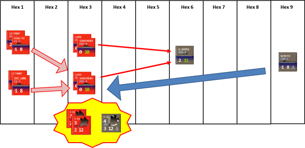 Single Player Modifications:  Player rolls 1D10 each Movement or Engagement opportunity; on an even roll the First Island Chain Coalition (FICC: Taiwan the U.S. and its allies who join) gets to move/engage and on odd rolls the CC does.  Each movement is done by a single stack per move.  Engagements are declared for one hex per roll.