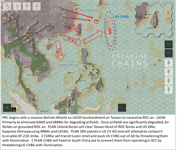 The PRC Course of Action was designed to establish PRC dominance of the Taiwan strait and the airspace over Taiwan as soon as possible in order to ensure the safe transport of the PRC amphibious forces to the island as soon as practical.  The time pressure on the PRC was to take advantage of the FICC window of vulnerability where the FICC was awaiting additional carriers to augment the one Carrier Battle Group on Station.