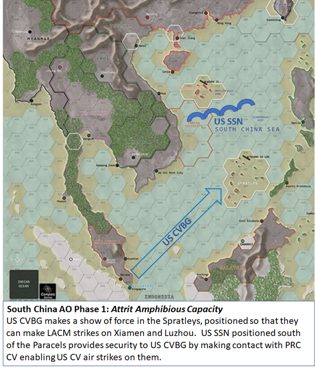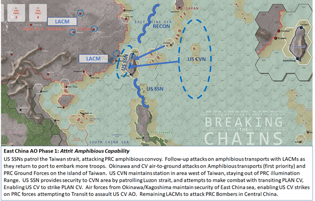 The FICC plan in phase 1 was to destroy as many of the PRC amphibious transports as possible.  By doing so, the PRC would be permanently deprived of the ability to convey troops to Taiwan and achieve their objective of overrunning the island.  PRC airborne forces alone were assessed as insufficient to take the island by themselves.  The PRC amphibious transports were to be destroyed by a combination of FICC Air (primarily ROC Air Force and US air from Okinawa and US CVBG) as well as US SSNs patrolling the Taiwan strait.