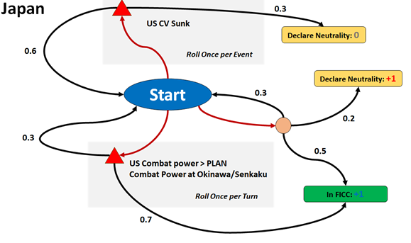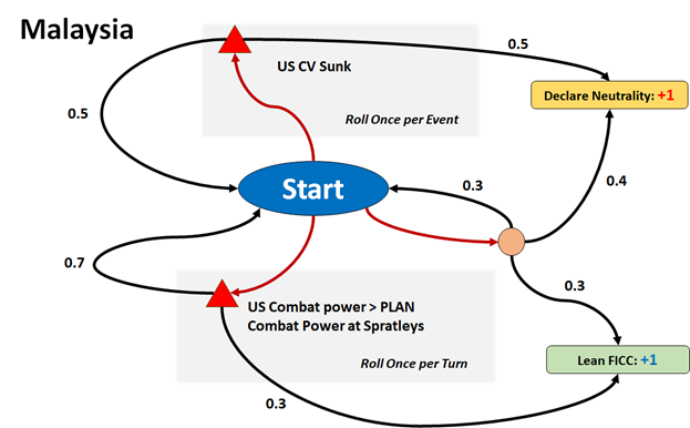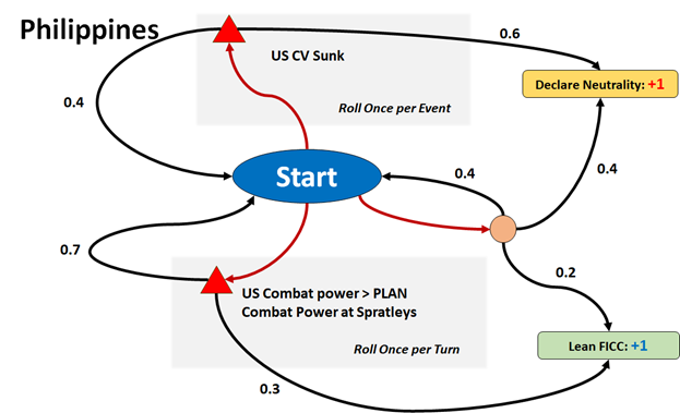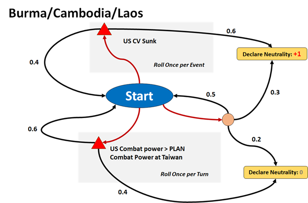 In my estimation, I had posited that the FICC primary objective was to Defeat the PRC Effort to Forcibly Annex Taiwan.  This objective was further decomposed into military and political branches of supporting objectives.  The political branch was addressed in the game by an enhanced political model which conditioned the probability of potential regional allies joining the respective coalitions to events on the board.  The game played did not last long enough (4 days) for much to have happened on the political front, so I will not have much to say on that in this post.