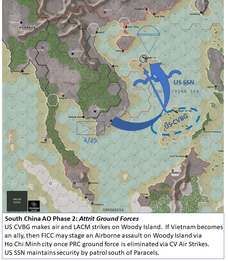 The FICC will achieve the supporting objective of getting Vietnamese participation in the FICC, as well as the political backing of the Philippines by a show of force in the Spratleys.  The FICC will also achieve the supporting objective of drawing PRCC forces from the decisive region with assaults to seize Chinese-held islands in the Paracels.
