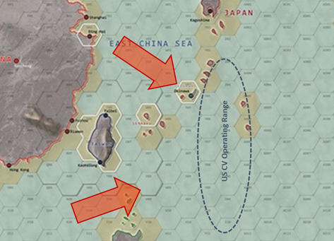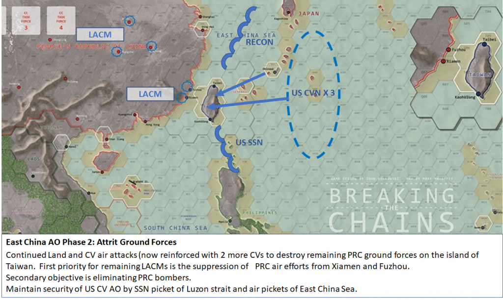 The Key Objectives of preserving the independence of the ROC will be achieved in the East China Sea region.  FICC Air forces operating from Okinawa, Taiwan and a US CVBG will first minimize PRCC combat power on the island of Taiwan by attacking PRCC amphibious assault vessels.  Subsequently FICC Air and Sea Forces will gradually gain control of the Air and Sea over and around the island in preparation for degrading PRCC forces from the island.