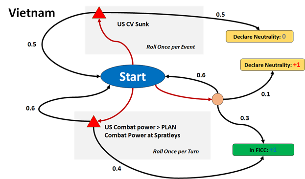 Vietnam’s chief aim will be to uphold its Spratley claims without unduly antagonizing the PRC; especially if China seems to be getting the better of the FICC in the conflict.  A show of force by the FICC to uphold Vietnamese claims in the Spratleys may be enough to induce Vietnam to join the FICC.  Vietnam could contribute forces (which would secure the Spratleys) and provide a vote for a FICC-favorable settlement.